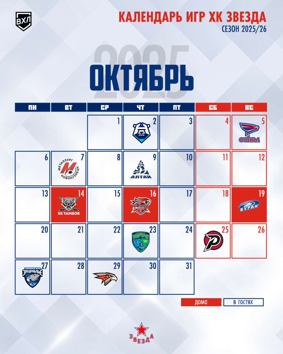 Первая домашняя игра в октябре состоится 14-го октября, в которой армейцы примут ХК «Тамбов». По ходу домашней серии «Звезда» на своей площадке примет «Ростов» (16 октября), «Буран» (19 октября).