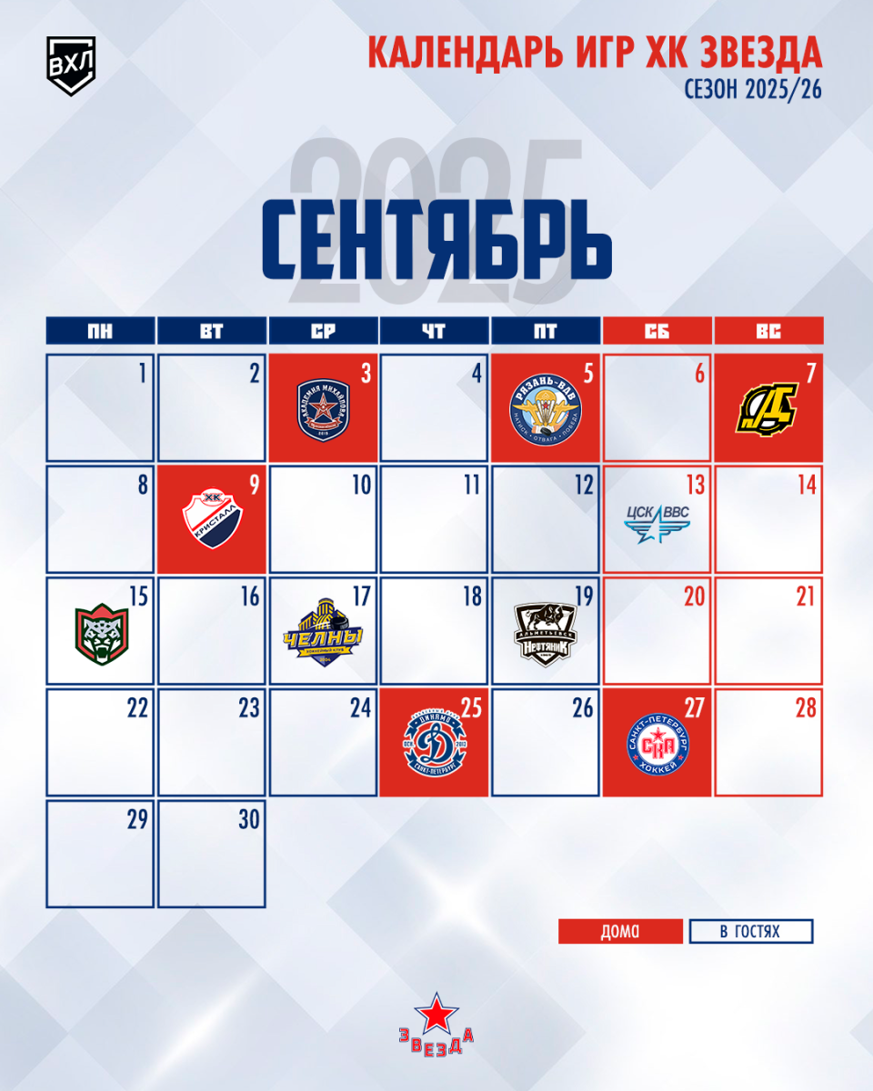 25 и 27 сентября «Звезда» сыграет дома с «Динамо» из Санкт-Петербурга и СКА-ВМФ.